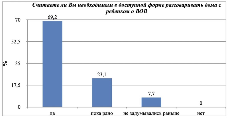 Все родители чтят память погибших на войне, помнят об этом. Кроме того, они убеждены, что информация по данной теме должна доноситься с учетом возрастных особенностей детей. Отрадно, что все родители готовы к совместной деятельности с детьми дома.