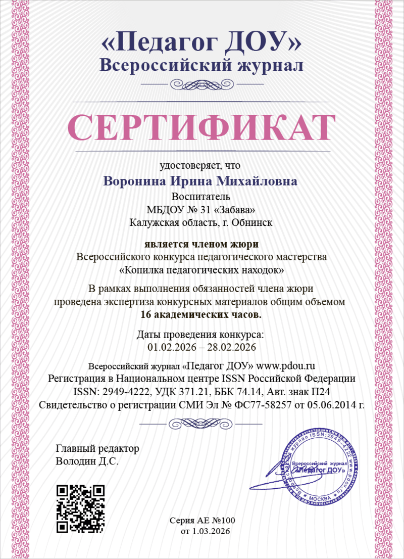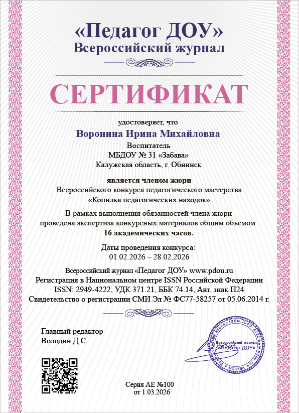 Получите сертификат члена жюри конкурсов для воспитателей и педагогов ДОУ